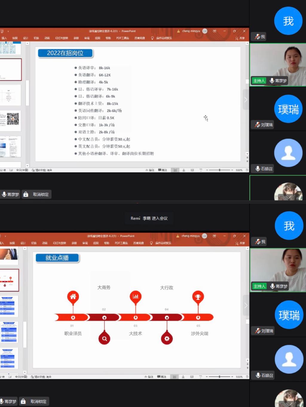 为进一步提高2022届毕业生就业质量,根据全球十大网赌正规官网书记院长直播带岗工作计划,2022年6月2日上午,全球十大网赌正规官网与郑州译线通翻译有限公司相聚云端,举行了翻译专业毕业生专场招聘会。本次招聘通过钉钉会议进行,全球十大网赌正规官网党委书记石皓召、郑州译线通翻译有限公司经理翟小娟、人事专员蒋彦梦参加,翻译专业40余名毕业生参加了此次网上直播招聘。